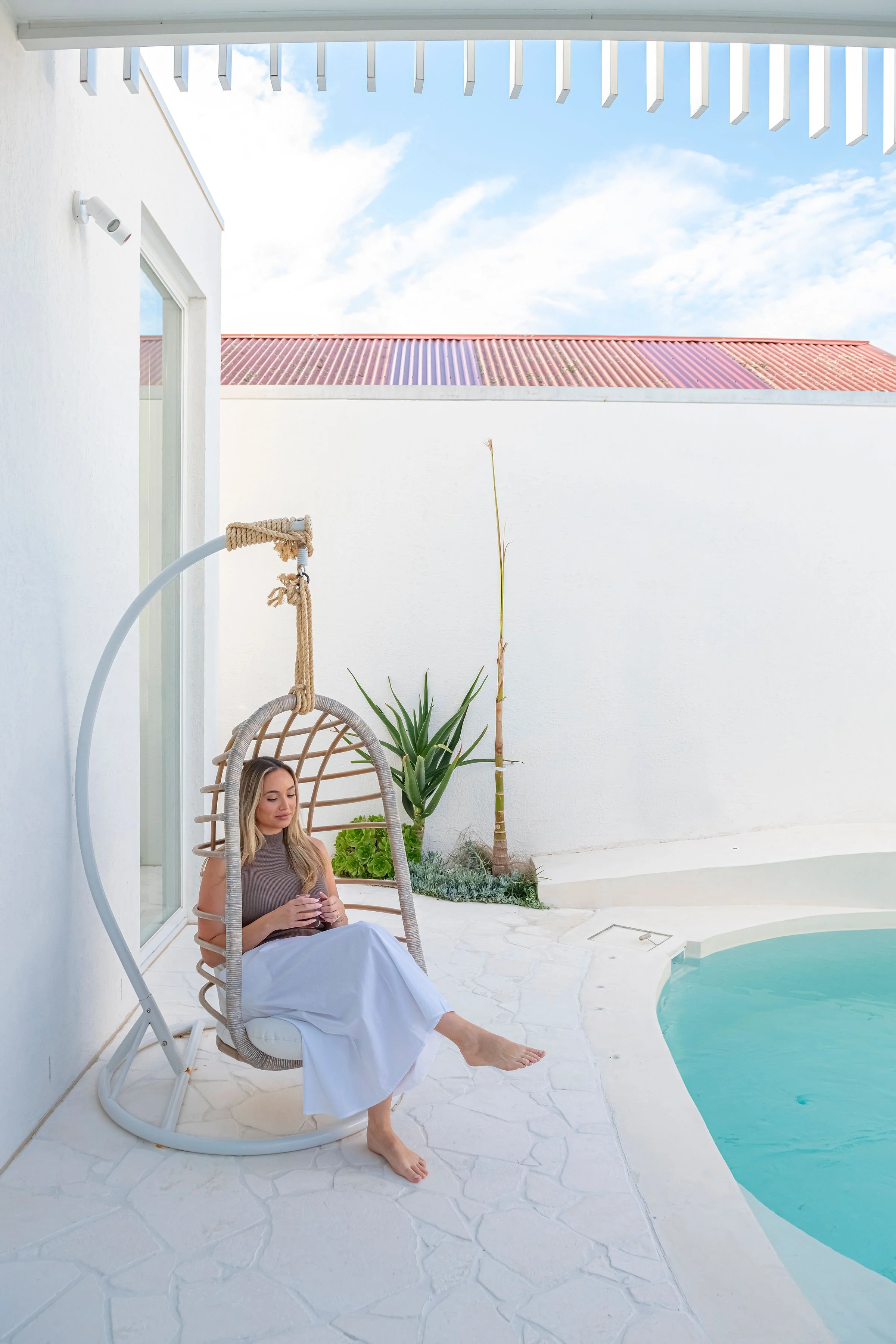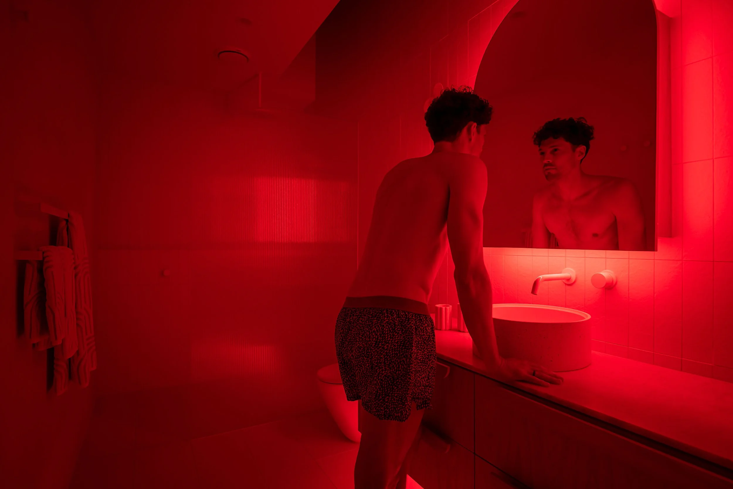 Most homes are built to be looked at. Alba was built to be lived in. Every material, every system, every decision in this house was made against one measure: does it make the person inside it feel better? Cleaner air. Cleaner water. Light that follows the rhythm of the day. Sauna, cold plunge, and heated pool, plumbed into the house from the first line of the brief. Copper throughout, red light in every bathroom, hydronic heat in the slab beneath the floor.